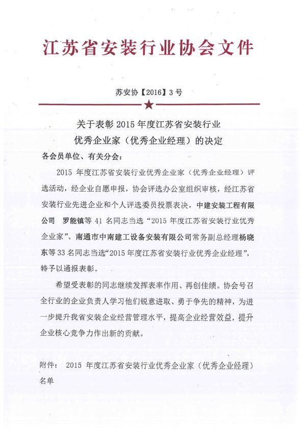 关于表彰2015年度江苏省安装行业优秀企业家(优秀企业经理)的决定