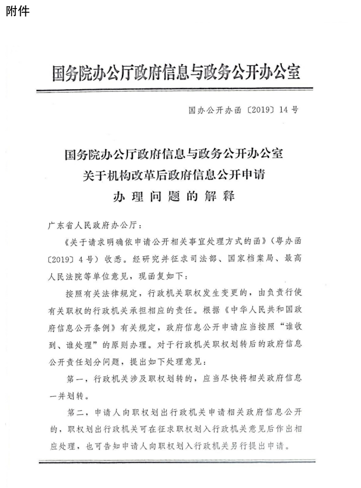 附件:国务院办公厅政府信息与政务公开办公室关于机构改革后政府信息公开申请办理问题的解释