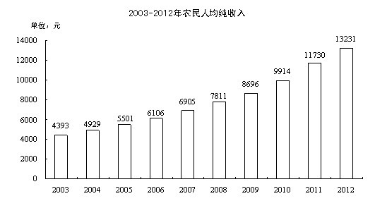 全年农村居民人均纯收入13231元,比上年增长12.8%;人均生活消费支出9839元,比上年增长15.6%。年末农村居民人均住房面积 54.8平方米