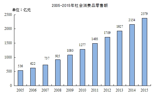 全年社会消费品零售总额2379.5亿元,增长9.9%。其中,城市消费品零售额1749.5亿元,增长10.1%;农村消费品零售额629.9亿元,增长9.1%。分行业看,批发和零售业消费品零售额2177.5亿元,增长9.8%;住宿和餐饮业消费品零售额202.0亿元,增长10.2%。