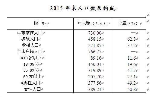 年末全市常住人口730.0万人,其中,城镇人口达到458.2万人,增长2.7%,城镇化率62.8%,比上年提高1.7个百分点。年末户籍人口766.8万人,比上年减少0.86万人。全市人口出生率7.60‰,人口死亡率8.98‰,人口自然增长率-1.38‰。