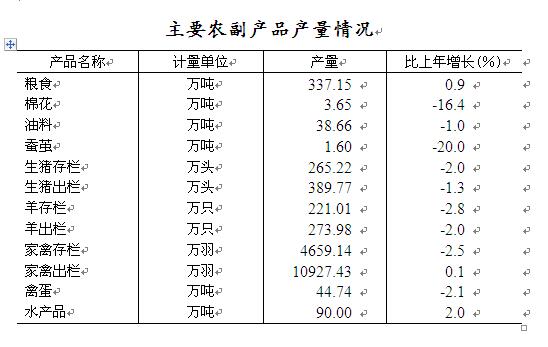 粮食播种面积775.31万亩,增长0.3%;棉花种植面积47.9万亩,下降14.2%;油料种植面积182.4万亩,下降4.1%;蔬菜种植面积199.2万亩,增长7.0%。