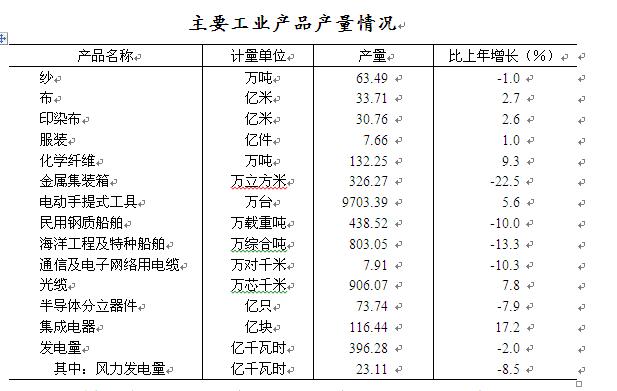 全市规模以上工业⑧增加值2902.3亿元,增长10.7%,其中,轻重工业分别增长8.8%和11.7%。分经济类型看,国有企业下降12.5%,股份制企业增长12.3%,外商及港澳台投资企业增长8.0%。分行业看,全市工业九大行业呈现“二快四稳二缓一降”的态势,其中,机械业和电子信息业产值均增长15.1%;轻工食品业、化工医药业、纺织服装业和冶金业平稳增长,同比分别增长8.9%、8.8%、5.6%和5.6%;船舶海工业和能源电力业分别增长4.1%和0.2%;建材业下降1.1%。工业产值中,装备制造业产值6694.8亿元,增长11.1%,占全市规模以上工业总产值的比重达48.6%,比上年提高1.1个百分点。