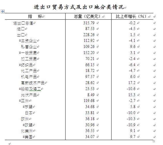 全年进出口总值315.8亿美元,下降0.2%,其中,出口总值228.3亿美元,增长1.5%;进口总值87.5亿美元,下降4.5%。年末与我市建立进出口贸易关系的国家和地区209个。全市有5406家企业有进出口业务,增长6.9%。